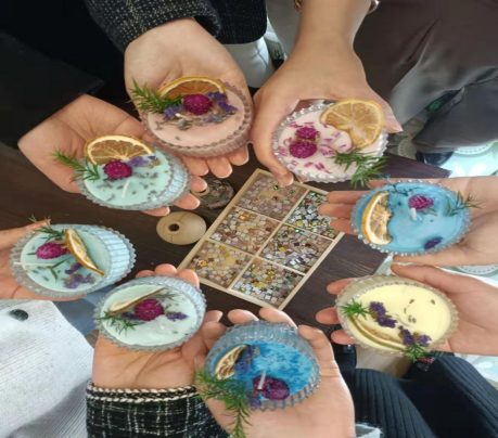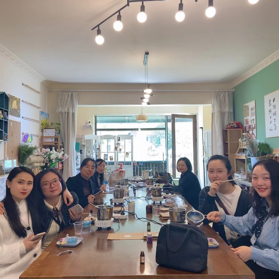 當(dāng)大家看到桌子上有各種材料及鍋具,十分好奇,都躍躍欲試。現(xiàn)場由3位手工老師指導(dǎo)大家從香薰選擇、顏色搭配、最后到融蠟開始。